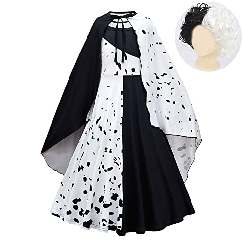 Lito Angels Cruella Deville Kostüm mit Umhang und Perücke für Kinder Mädchen, Schwarzer und Weißer Dalmatiner Fleck Kleid Verkleidung, Größe 11-12 Jahre 152, A