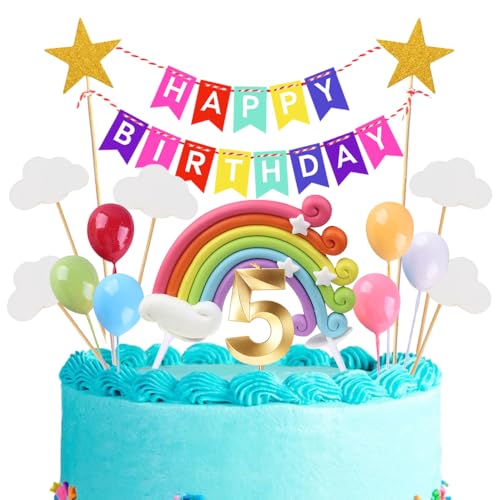 5th Geburtstags Kuchen Topper Birthday Torten Dekoration Geburtstag Kuchendeko Gold Zahl 5 Kerzen Tortendeko Set Regenbogen Ballon Wolke Sterne für Mädchen Jungen Geburtstags Party Supplies