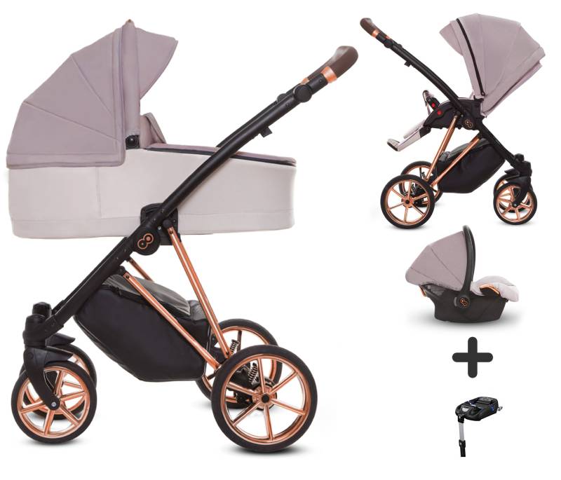 TPFLiving 4in1 Kinderwagen Musse Ultra Stoff mit IsofixDen Kinderwagen gibt es mit 4 verschiedenen Rahmen. Sie haben die Auswahl zwischen Rosé Gold, Gold, Chrom oder Silber.Den Stoffbezug gibt es in 6 unterschiedlichen Farben. Schwarz, Zen, Pastell, Mint, Apricot und Lila.Besonders zeitlos, mit Ausblick für Ihr Kind und trendy Dieser moderne, besondere Kinderwagen überzeugt durch sein Panoramafenster in Babywanne und Buggyaufsatz. Selbst Babys sehen so, was in der Welt um sie herum passiert und haben endlich einen anderen Ausblick als nur die Decke Ihrer Babywanne. Ihr Baby wird es lieben. Und damit keine Insekten in den Kinderwagen gelangen, schützt das Insektennetz. Jetzt mit Musse Ultra zeitlos und ein Hingucker gleichzeitig sein! Das Gestell ist hochglänzend und somit ein absoluter Eyecatcher. Die Aufsätze in einfarbigen, hochwertigen Stoffen komplettieren den Look. Zeitlose Optik und viele durchdachte und praktische Extras, die Sie im Alltag überzeugen. So kann der 4 in 1 Kinderwagen Musse Ultra in der Stadt wie auch in Wald und Wiesen überzeugen, durch Räder, die sich an jeden Untergrund anpassen und seine Teleskopfederung. Der Kinderwagen erfüllt Ihre Erwartungen und übertrifft die ihres Kindes.Babywanne gibt Sicherheit in den ersten 6-9 MonatenDie im Lieferumfang enthaltene Babywanne kann in Sekunden ohne Adapter auf das Gestell aufgesetzt werden. Die Wanne ist geräumig und tief (Außenmaße 84 x 41cm). So passen in diese Wanne Babys bis zu 9 Monate.Besonders praktisch, wenn die Babys schon anfangen zu sitzen, sie aber noch nicht auf den Sportwagen umsteigen möchten. Der Clou an dieser Babywanne ist das große Panoramafenster, so dass schon die Kleinsten Ihre Umwelt erkunden können.Außerdem besonders praktisch im Sommer zur Luftzirkulation innerhalb der Wanne. Als Schutz vor Insekten dient das praktische Moskitonetz. Extra-Komfort für Ihr Baby!Die Position können Sie über die Innenseite der Wanne mehrfach höhenverstellen, von komplett liegend bis sitzend. Dazu kann das Verdeck stufenlos verstellt werden. Sie können ein zusätzliches Sichtfenster im Verdeck öffnen. Die komfortable Fußabdeckung besitzt einen zusätzlichen Sonnenschutz, der nach Bedarf hochgeklappt und am Verdeck befestigt werden kann. Durch das Kufengestell können Sie die Liegewanne auf dem Boden stehend angenehm wiegen und mit den Schlaufen die Wanne einfach tragen. Inklusive Regenschutzhaube.Das Besondere an dieser Babywanne: Der Stoff kann an vielen Teilen entfernt werden, so dass Ihr Baby eine gute Sicht hat und viel Luft in den Wagen kommt. Schutz bietet aber immer noch das Moskitonetz, so dass lästige Insekten draußen bleiben.Die weiche Matratze aus 100% Baumwolle und die Polsterung sind abnehmbar und bei 30 Grad waschbar.Sportwagen sicher die Welt erkunden, ab 6-9 Monate bis 3 JahreSobald die Kleinen sicher sitzen können, kann der Kinderwagen in einen Sportwagen verwandelt werden. Dabei kann die Sitzeinheit in und gegen Fahrrichtung aufgesetzt werden. Die breite und verstellbare Rückenlehne kann von liegend bis sitzend in mehreren Stufen verstellt werden. Die Fußstütze kann passend dazu 3-fach an die Positionen angepasst werden. Auch hier ist für eine perfekte Luftzirkulation gesorgt, dank des Panoramafensters. So ist der Aufsatz auf Wunsch lichtdurchflutet. Der gepolsterte 5-Punkt Sicherheitsgurt schützt Ihr Kind maximal. Das große Verdeck kann an die Bedürfnisse Ihres Babys angepasst werden. Zudem kann eine Sonnenblende je nach Bedarf vor oder zurück geklappt werden. Das Besondere an diesem Buggyaufsatz: 4 zusätzliche Sichtfenster im Verdeck sorgen für mehr Licht und eine gute Luftzirkulation. Zum praktischen Ein- und Aussteigen kann der Sicherheitsbügel zur Seite geklappt oder mit einem Handgriff auch ganz abgenommen werden. Eine schützende Beinabdeckung ist mit im Lieferumfang enthalten. Besonders praktisch bei Wind und unbeständigem Wetter. Auch hier kann die Luft besonders gut zirkulieren, wenn Sie den Stoff am Verdeck entfernen und nur noch das Moskitonetz vorhanden ist.Babyschale / Autositz praktisch für unterwegsNicht nur optisch sehr ansprechend, sondern auch überzeugend durch höchste Sicherheit und Bedienerfreundlichkeit. Der Autositz entspricht dem europäischen Sicherheitsstandard ECE R44/04. Die Babyschale wird im jeweiligen Muster bzw. der Farbe des Kinderwagens mitgeliefert. Ausgestattet mit einem Tragebügel und integriertem Sonnenverdeck, sowie mit einem 3 Punkt Sicherheitsgurt. Von Geburt an bis ca. 11 kg oder ca. 12 Monate nutzbar. Zusammen mit Ihrem Kinderwagen können Sie die Autoschale mithilfe von Adaptern auch als Travelsystem einsetzen. Die Adapter sind bereits im Lieferumfang enthalten. So können Sie die Babyschale auf das Gestell setzen. Praktisch auch zum Tragen für kurze Strecken oder als sicheres Transportmittel im Auto. Durch den verstellbaren Griff der Babyschale können Sie es variabel nutzen. Der Bezug ist abnehmbar und waschbar. Einbau im Auto entweder mit Isofix oder alternativ mit dem Dreipunktgurt Ihres Autos.Informationen über IsofixMit Isofix lassen sich Kindersitze einfach und besonders fest im Auto verankern. SICHER, EINFACH und SCHNELL!ISOFIX ist ein international standardisiertes System, das die sicherste, leichteste und schnellste Möglichkeit darstellt, eine Babyschale / Autoschale korrekt zu installieren, ohne den Sicherheitsgurt des Autos zu Hilfe nehmen zu müssen. Der Name ISOFIX steht für ISO (International Standardisation Organization) und FIX (Fixierung). Einfach die Babyschale auf die Isofix-Basis klicken. Dazu installieren Sie die Isofix-Basis mit wenigen Handgriffen für die Dauer der Nutzung Ihrer Babyschale fest im Auto mithilfe der Isofix-Vorrichtung in Ihrem PKW.Weitere Details:Wartungsfreie 10 Zoll Gelräder vorne, die je nach Untergrund 360 Grad schwenkbar sind (für die Stadt) oder sich mit einem Handgriff feststellen lassen, für Spaziergänge und Erkundungstouren durch den Wald oder Feldwege. Und 1