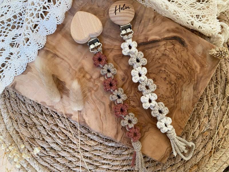 Handgeknüpfte Blumenschnullerkette aus 100 % OEKO Tex Baumwolle. Die Länge der Kette ohne Clip beträgt ca. 17 cm, siehe DIN EN 12586. Suche dir einen Clip aus, entscheide dich für deine Lieblingsfarben und ich knüpfe dir deine ganz individuelle Schnullerkette. Gerne personalisiere ich sie dir auch mittels Lasergravur. → Unter dem Reiter "Füge deine Personalisierungswünsche hinzu", findest du alle zusätzlich nötigen Angaben. ← Da jede Kette handgefertigt ist, kann es zu kleineren Abweichungen kommen. Hast du sonstige Wünsche oder Fragen, dann schreibe mir gerne eine Nachricht. ❤️ Tipp: Stöbere auch gerne durch die anderen Angebote in meinem Shop, hier findest du auch tolle Sets mit Schlüsselanhängern. | Blumenschnullerkette, Schnullerkette Für Mädchen, Personalisiert, Mit Namen, Makrameeschnullerkette