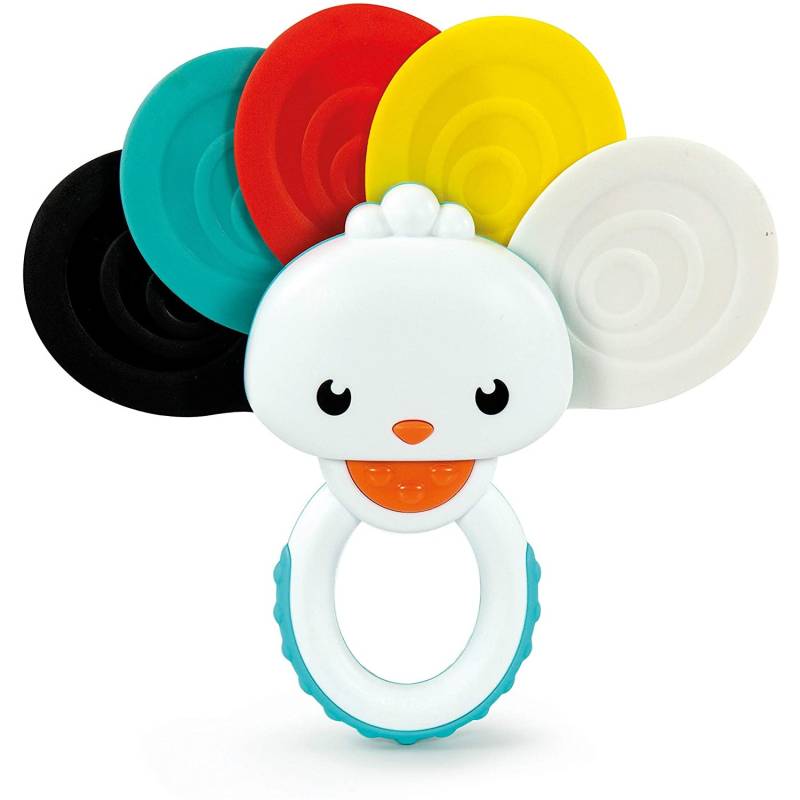 - Eine süße, pfauenförmige Rassel, die perfekt ist, um den Anblick von Babys in den ersten Lebensmonaten zu stimulieren.