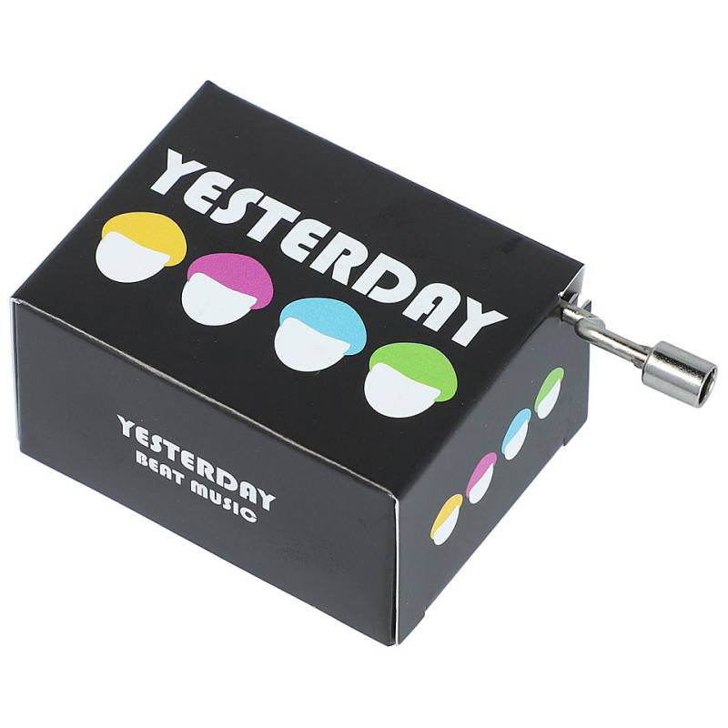 Eine Spieluhr mit dem Beatles-Hit "Yesterday" in einer farbigen stabilen Karton-Box. · Titel: Yesterday · Komponist: The Beatles · Material: Metall, Pappe · Abmessungen: 6 x 4,5 cm · farbige stabile Karton-Box, die gleichzeitig als Resonanzkörper dient · Spieluhr