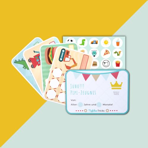 20 STICKERKARTEN mit drei bis neun Kästchen, womit du dein Kleinkind zum richtigen Zeitpunkt und mit einer passenden Regelmäßigkeit belohnen kannst. Dadurch, dass die Belohnungen schrittweise reduziert werden, bleibt dein Kind motiviert und selbstbewusst! 120 AUFKLEBER zum Aufkleben, um jeden Fortschritt und Erfolg auf dem Töpfchen oder der Toilette zu feiern. Dein Kind kann die Sticker nach jedem Erfolg selbst auf die Karten kleben. 1 PIPI-ZEUGNIS, das du deinem Kind am Ende des Programms geben kannst, um ausgiebig zu feiern: endlich trocken und windelfrei! Herzlichen Glückwunsch zu diesem wunderbaren Meilenstein! PERFEKT FÜR EIN ZWEITES KIND – Unsere Belohnungssysteme sind ideal, wenn du die Töpfchen Tricks für ein zweites Kind verwenden möchtest, oder wenn du einfach ein Belohnungssystem brauchst, um dein Kind zu unterstützen, andere Aufgaben oder Fähigkeiten zu lernen. EINFACH ZU VERWENDEN – Du kannst die Stickerkarten irgendwo in der Nähe des Töpfchens oder die Toilette aufhängen und deinem Kind erklären, wie es funktioniert und wann es einen Sticker aufkleben kann. Dein Kind kann die Sticker dann selbst auf die Stickerkarten kleben und viel wichtiger noch: er oder sie kann gut im Auge behalten, wenn die Karte fast voll ist!, Hersteller: Töpfchen Tricks