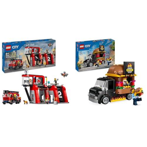 LEGO City Feuerwehrstation mit Drehleiterfahrzeug, Feuerwehr-Spielzeug & City Burger-Truck, Bauset mit Spielzeug-Auto für 5-jährige Kinder