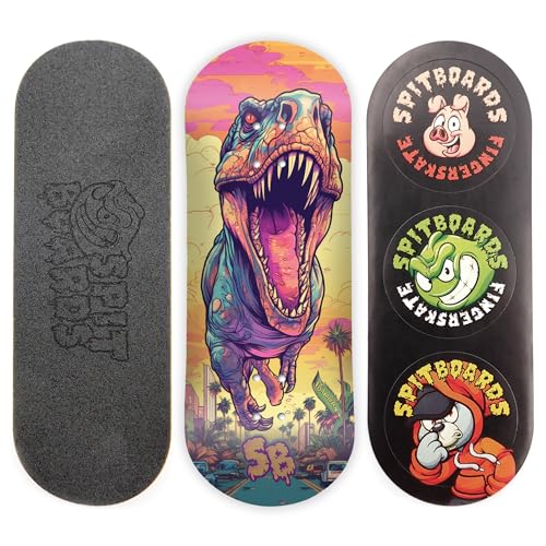 SPITBOARDS 34mm Fingerboard Deck - Real Wood (5-Layers) Classic Popsicle Street Shape - Size: 34 x 96 mm - Single Graphic Deck (Real Wear) - Optimized Concave - t-rex