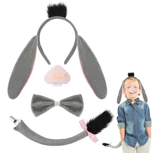 4 Stück Esel Kostüm Erwachsene Kinder Set, Esel Ohren Haarreif Schwanz Nase Fliege, Esel Kostüm Zubehör Tier Kostüm Kinder Erwachsene für Cosplay Halloween Fasching Geburtstag Thema Party Weltbuchtag