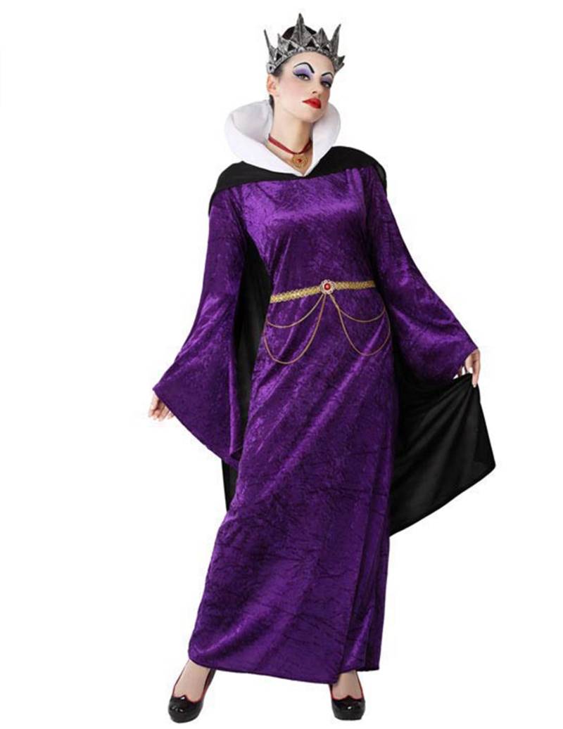 Das fiese Königin-Kostüm für Damen besteht aus einem Kleid mit Umhang. Die Schuhe, die Krone und die Halskette sind nicht im Lieferumfang enthalten. Das Kleid ist knöchellang geschnitten und aus einem samtartigen Stoff gehalten. Das violette Kleid zieht direkt alle Blicke auf sich. In der Mitte wird das Kleid mit einem goldenen Gürtel, der angenäht ist, tailliert. Ein roter Stein ziert den Gürtel. Oben schließt das Kleid mit einem weißen Kragen ab. Mit dem schwarzen Umhang wird das Kostüm vervollständigt. Werden Sie zu Halloween zur bösen Herrscherin mit dem Königin-Kostüm für Damen!