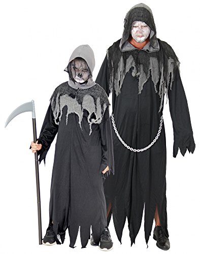 Das Sensenmann Halloween Kostüm gibt es in den Kinder-Größen 122/128, 134/140/, 152/158 und 164/170 Unser Sensemann Kostüm für Herren gibt es in den Größen M/L, XL, XXL und XXXL Das Halloweenkostüm kann natürlich nicht nur zu Horror-Partys, sondern auch an Karneval oder Fasching getragen werden. Ein Karnevalskostüm das Väter im Partnerlook mit Ihren Kindern an Halloween tragen können. Das Sensemann Kostüm besteht aus einer schwarzen Robe mit Kapuze. Die Sense muss separat bestellt werden., Hersteller: Foxxeo