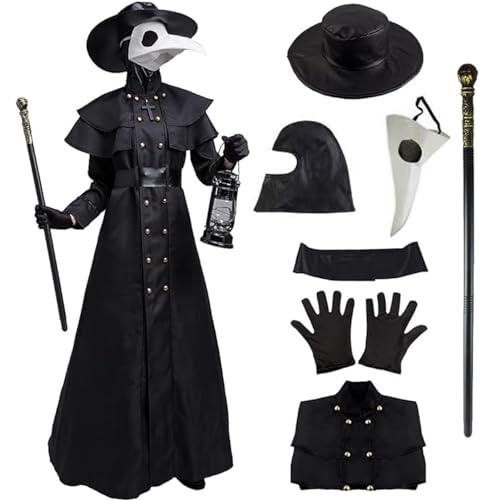 Esiaphia Pestdoktor-Kostüm Halloween 6-Tlg Renaissance Mittelalter Steampunk Mönch Priester Cosplay mit Maske, Hut, Robe, Stock (Black 1, XL)