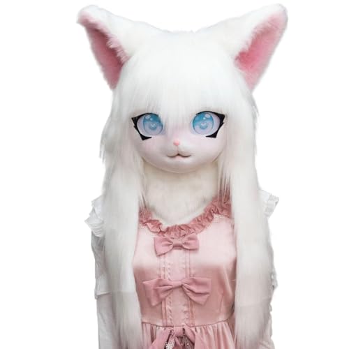 Pelziger pelziger Kopf, volle Kopf pelzige Maske mit großen Augen, pelzigen Ohren und weißen langen Haaren, Tierkopf -Fursuit -Maske Kostüm für Halloween Maskerade Cosplay -Kostümrequisiten