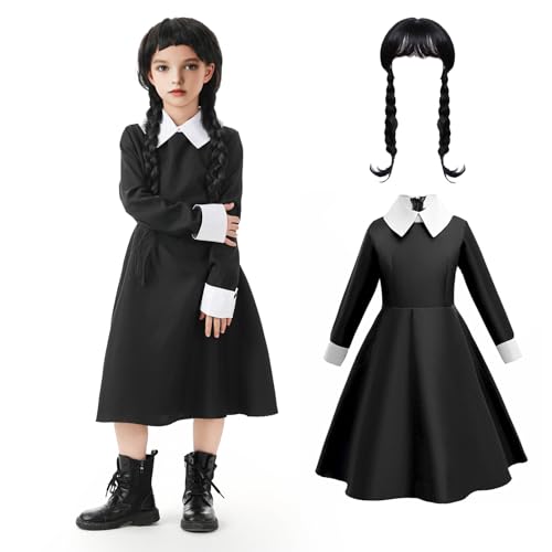 ASSUGO Wensdey Kostüm Kinder, Halloween Kostüm, Inklusive Schwarzes Kleid und Wednesday Perücke, Geeignet für Halloween Partys, Cosplay (140)