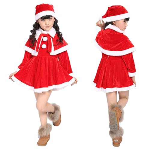 AUEJACKY Weihnachtsfrau Kleid Mädchen,Kinder Mädchen Weihnachtsmann Kostüm, Weihnachtskleid Kinder Mädchen, Kinder Weihnachtskleid mit Mütze, Weihnachtskostüm Set für Cosplay Party (120cm)