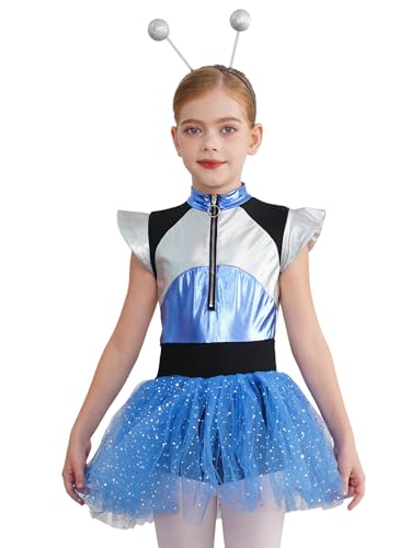 Agoky Mädchen Alien Kostüm Glänzende Kleider mit Tutu Rock Haarreifen Ballettkleid Tanzkleid Halloween Fasching Cosplay Outfits Blau 146-152