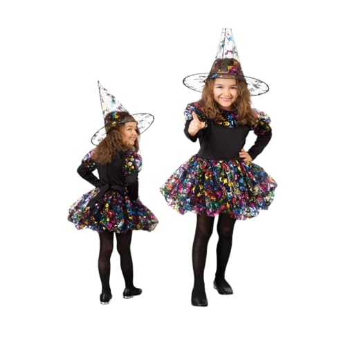 Lieferumfang: 2-tlg. Kleid und Hexenhut Größe: 104, 116, 128 Farbe: schwarz, bunt Material: 100% Polyester, Hersteller: KarnevalsTeufel.de