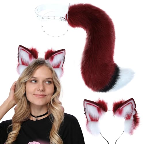 BEAHING Foxes Tail Cosplay, Wolf Ohren und Heck Plüsch Stoff Wein rot mit eingebauten Skelett Cosplay Kopfwege Foxes Kostüm Stall Foxes Ohren und Schwanz Set für Lolita, Weihnachtspartyspielzeug