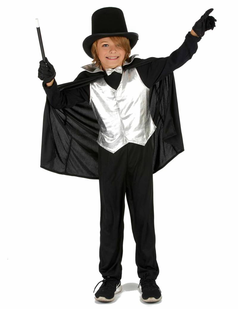 Dieses Zauberer Kinderkostüm besteht aus einem Umhang, einer Weste und einem Paar Handschuhe (Hut, Zauberstab, schwarzer Pullover, Hose und Schuhe nicht inbegriffen). Der schwarze Umhang wird mit einem Klettverschluss, der mit einer silbernen Fliege verziert ist, am Hals befestigt. Die Weste besteht komplett aus glänzendem, silbernen Stoff und schließt vorne ebenfalls mit Klettverschlüssen. Die mitgelieferten Handschuhe sind kurz und schwarz. Ein tolles Magier Kostüm für Kinder, das perfekt für Fasching und Kostümpartys geeignet ist!