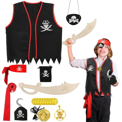 Piratenkostüm für Kinder: Das Piraten Kostüm Kinder enthält 1 x Piratenweste, 1 x Pirat Bandana, 1 x Pirat Augenklappe, 1 x Piratengürtel, 1 x Holz Piraten Messer, 1 x Piraten Haken, 1 x Piraten Ohrring, 1 x Halskette,1 x Geldbeutel, 10 x Goldmünzen. Ein Komplettpaket für endlose Piratenabenteuer! Klassisch und zeitlos: Alle Piraten-Accessoires zeigen die kultigen Piratenmotive - Totenkopf und Piratensäbel. Der klassische Piraten-Look bietet Kindern das perfekte Piraten-Spielerlebnis. Geh mit deinen Freunden auf ein Abenteuer! Hochwertige Qualitäten: Unser Piratenschmuckset ist aus hochwertigen Materialien gefertigt, Piratenweste, das Bandana, die Augenklappe usw. und der Geldbeutel sind aus Stoff. Die Holz Piraten Messer sind aus Holz und die Kinder können sie nach Belieben anmalen und bemalen, um ein einzigartiges Piratenschwert zu gestalten. Alle Accessoires haben keine scharfen Kanten und sind für Kinder sicher zu benutzen. Mehrzweck-Piraten Accessoires: Kinder Piratenkostüm Zubehör eignet sich perfekt für Karneval, Fasching, Piraten-Mottopartys, Piraten-Cosplay, Maskerade, Schulaufführungen, Kindergeburtstag, Bühnenauftritte, Welttag des Buches und vieles mehr. Pirat Spielzeug kann auch als Partytütenfüller, Gastgeschenke, Belohnungen im Klassenzimmer und mehr verwendet werden. Super Geschenk für kleine Pirat: Unser Kinder-Piraten-Set ist perfekt für Kinder mit einem Sinn für Abenteuer. Perfekt für Kinder, die Piraten spielen wollen. Piraten Kostüm Zubehör fördert auch die sozialen Fähigkeiten, die Neugierde und die Fantasie der Kinder., Hersteller: LOHAME