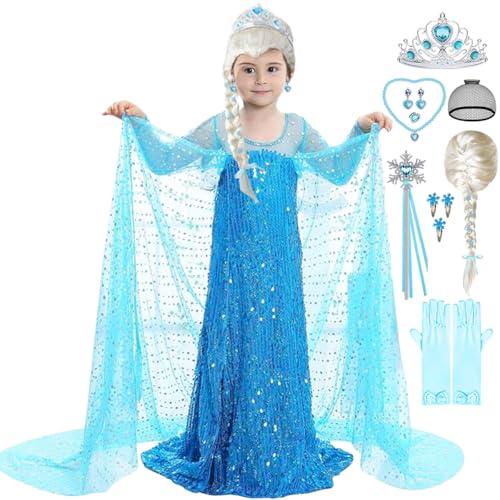Lieferumfang: 1* Blaues Prinzessin kostüm, 1* Prinzessin krone, 1* Prinzessin stab, 1* Ohrring, 1* Ring, 1* Halskette, 1* Perücke, 1* Haarnetz, 1* Handschuhe, 3* Haarspangen. Die luxuriösen Accessoires machen Ihre kleine Prinzessin noch schöner und attraktiver! Bequemes Futter: Das Futter des Prinzessinnenkleides ist aus hochwertigem Stoff, weich, bequem und sehr atmungsaktiv. Details: Dieses blaue Kleid ist mit Paillettenverzierungen und einem langen umhang versehen, der sie wie in einer Märchenwelt aussehen lässt. Das Kleid ist über und über mit Pailletten verziert und sieht dadurch wunderschön aus. Es hat einen Reißverschluss auf der Rückseite für einfaches An- und Ausziehen. Der bodenlange umhang sorgt für einen Hauch von Eleganz, während der Seitenschlitz einen Hauch von Verspieltheit verleiht. Geeignete Anlässe: Perfekt für Halloween, Weihnachten, Karneval, Geburtstagsfeiern, Mottopartys und Rollenspiele. Dieses blaue Elsa-Kostüm beflügelt die Fantasie der Kinder und erweckt ihre Lieblingsfiguren zum Leben. Schönes Geschenk: Prinzessin Kleid ist der Traum eines jeden kleinen Mädchens. Es wird ein schönes Überraschungsgeschenk für kleine Mädchen sein, die vor Freude springen werden, wenn sie es sehen., Hersteller: LiUiMiY