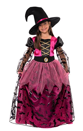 Magicoo Fledermaus Prinzessin Rosa Hexenkostüm für Kinder Mädchen inkl. langes Kleid, & Hexenhut - Gr 104 bis 140 - Halloween Hexe-Kostüm Kind (104)