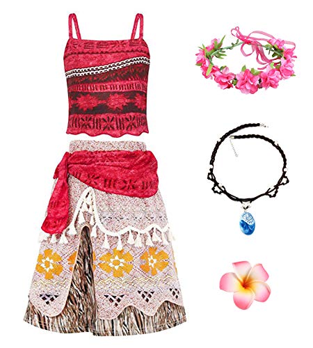 New front Mädchen Moanna Prinzessinnenkleid Vaiana Verkleidung Halloween Fasching Weihnachten Kostüm für Kinder Zubehör Halskette Blumenreife Haarspange Oberteil+Rock,Rot,110