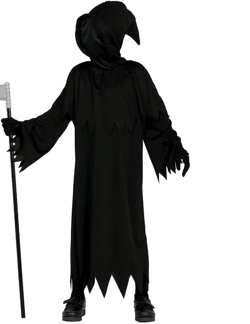 Das Sensenmann-Kinderkostüm besteht aus einer langen Robe und einer Kopfbedeckung. Die Handschuhe, die Sense und die Schuhe sind nicht im Lieferumfang enthalten. Die lange Robe des Todes-Kostüms ist komplett schwarz und an Ärmeln und an den Füßen ausgefranst. Die Ärmel sind ausgestellt und lang. Die Kopfbedeckung ist ebenfalls schwarz und hat vor dem Gesicht ein schwarzes Netz, um einerseits das Gesicht zu bedecken und andererseits Ihrem Kind eine gute Sicht zu gewährleisten. Mit den passenden Accessoires können sie das Sensenmannkostüm Ihres Kindes vervollständigen, damit es zu Halloween eine erschreckende Erscheinung abgibt!