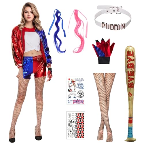 Alaiyaky Harley Kostüm Damen, Quinn Cosplay Clown Outfits Quinn Kostüm mit Handschuhen Halskette Perücke Strümpfe Aufkleber Ballon, Coole Mädchen Outfits für Karneval Halloween (Damen, S)