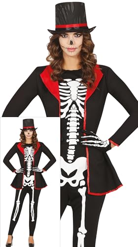 BESCHREIBUNG: Schick oder furchterregend? Dieses Skelett-Kostüm kann beides… und zwar gleichzeitig. Das Ensemble umfasst ein schwarzes Jackett mit roter Borte sowie ein Oberteil und eine Hose mit einem coolen Skelett-Print. Schlüpfe in dieses Outfit und werde zu Meisterin der Eleganz und des Schreckens! LIEFERUMFANG von diesem Schickes Skelett Halloween Kostüm Damen: Jackett, Oberteil, Hose. NICHT_ENTHALTEN: Hut, Skeletthandschuhe GRÖßE: Kostüm Halloween Damen M 36-38 KOSTÜMMAßE ca.: Brustumfang 93-96 cm, Taillenumfang 73-75 cm, Hüftumfang 99,5-102 cm MATERIAL: Dieses Halloween Karneval- oder Faschingskostüm Damen beeindruckt mit einem tollen Design und ist liebevoll verarbeitet aus 100% Polyester, damit du bei deiner nächsten Kostümparty eine großartige Zeit haben kannst., Hersteller: FIESTAS GUIRCA