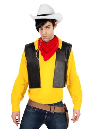 Der Cowboy, der schneller schießt als sein Schatten - hochwertiges Lizenzkostüm des Westernhelden aus den gleichnamigen Comics Enthält: Hemd, Weste, Halstuch und Pistolenholster - Ohne Perücke und Cowboyhut (separat erhältlich) Gelbes Hemd mit bereitem Kragen und funktionalen Knöpfen - robuste Qualität aus 100% Leinen Schwarze Weste mit weitem Schnitt und offener Front in Lederoptik Das rote Dreieck-Halstuch aus 100% Leinen ist mit mehrlagigem Saum gefertigt, der Pistolengürtel aus Stoff in Lederoptik ist stufenlos verstellbar und so bequem tragbar, Hersteller: Maskworld
