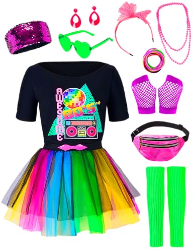 Spooktacular Creations Regenbogen 80er Jahre Kostümset mit T-Shirt, Tutu, Stirnband und anderen, Halloween-Cosplay-Zubehör