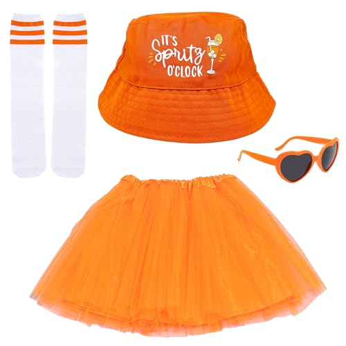 YAEGIMHT Apero Spritz Kostüm Damen Outfit, Aperol Socken, Bestickte Aperol Fischerhüte, Retro Brillen in Herzform, Orange Rock, Geschenk für Aperol-Liebhaber Orange Party Cosplay Kostüm Zubehör