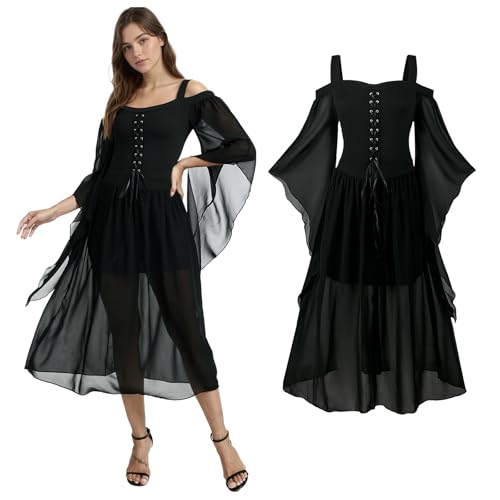 YORDET Damen Mittelalter Kostüm Gothic Kleid Mit Trompetenärmel Renaissance Kostüm Korsett Viktorianisches Kleid für Halloween Party (Schwarz, M)