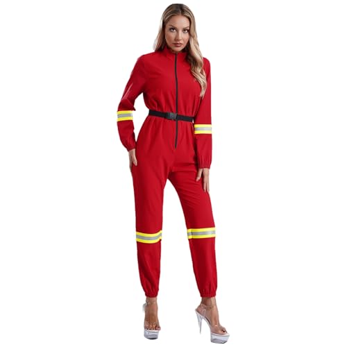 dPois Damen Feuerwehrfrau Kostüm Einteiler Jumpsuit Overall Ganzkörperanzug Arbeitsanzug Uniform Cosplay Outfit Fasching Karneval Kostüm Rot L