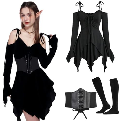 Verführerisches Gothic-Outfit: Das Set umfasst ein elegantes Trägerkleid mit Trompetenärmeln und asymmetrischem Schnitt, ein figurschmeichelndes Korsett und kniehohe Strümpfe – perfekt für einen dramatischen und stilvollen Gothic-Look Betonte Weiblichkeit durch Korsett: Das Korsett sorgt für eine schmale Taille und eine feminine Silhouette, perfekt für Gothic-, Mittelalter- oder Steampunk Events Sexy Trifft Individualität: Das asymmetrische Kleid mit zarten Trägern und Trompetenärmeln verleiht Ihrem Look eine einzigartige Mischung aus Cool und lebhafter Persönlichkeit Stilvolle Accessoires: Die kniehohen Strümpfe vervollständigen den Look und bieten gleichzeitig Komfort, ideal für lange Tragezeiten bei besonderen Anlässen Langlebige und hochwertige Materialien: Aus atmungsaktiven und strapazierfähigen Stoffen gefertigt, bietet das Set Komfort und Langlebigkeit für viele Gelegenheiten, Hersteller: kasahara