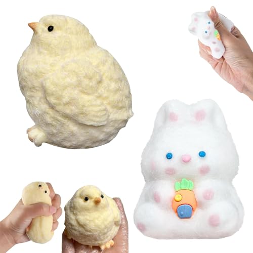 2 Stück Squishy Hase Osterküken Squishies, Anti Stress Spielzeug, Weiches Quetschspielset mit Kaninchen und Küken, Entspannendes Knautschspielzeug für Kinder