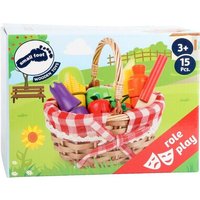 Geflochtener Einkaufskorb gefüllt mit Erdbeeren, Möhre, Aubergine, Maiskolben, Apfel und Banane. Mit dem beigefügten Messer aus Holz können die Lebensmittel an den Klettverbindungen durchgeschnitten werden. So können Kinder einkaufen wie die Großen und echte Alltagssituationen nachspielen. Im Holzkorb mit Tragegriff wird der ganze Einkauf dann nach Hause getragen. Eine tolle Ergänzung für den Kaufmannsladen. Durch das Zerschneiden der Lebensmittel kommt neben dem Spaß am Spielen auch der motorische Lerneffekt nicht zu kurz!