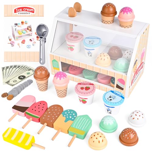 Euakee Eisdiele Kinder Holz, Kinderküche Zubehör Kaufladen Zubehör Kaufmannsladen Zubehör, Eisladen Kinder Rollenspiele Holzspielzeug Montessori Spielzeug Geschenk für Jungen Mädchen ab 3 Jahre