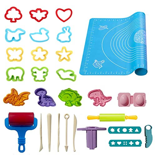 Funbero Knete Zubehör Set,29 Stück Teig Plastilin Werkzeugset für Kinder, Einschließen Teig Plastilin Werkzeuge, Formen,Teigrolle, Knetmatte