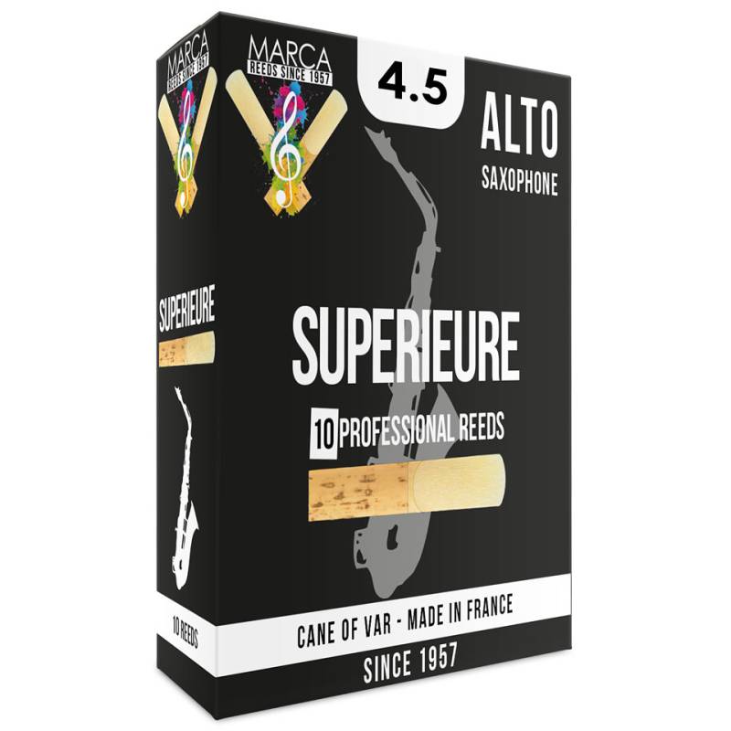 Die Superieure Blätter von Marca für das Altsaxophon in der Stärke 4,5 und in der 10er Packung. · Instrument: Altsaxophon · Material: Schilfrohrholz · Stärke: 4,5 · Zuschnitt: filed · offen für jede Stilistik · traditionelle Dicke von Schaft, Herz und Spitze · hohe Konsistenz in den Stärken · Verpackungseinheit: 10 Stück · Produktionsland: Frankreich · Blätter