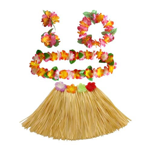 5 Stück Hawaii Outfit Damen,Hawaii Kostüm Damen,Party Faschingskostüme,Bastrock Hawaii Rock Set,Einfach Blume Stirnband,Kette Girlanden Hula Rock für Sommer Beach Tropische Kostüme Kinder/Erwachsene