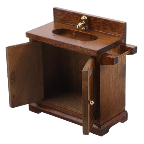 SOPOTUTU Miniatur Waschbecken mit Walnuss Schrank aus Holz Detailliertes Puppenhaus Zubehör für Kreative Rollenspiele und Kindgerechtes