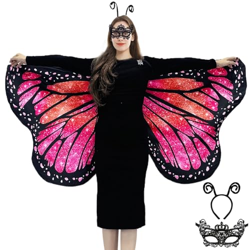 Schmetterling Umhang Damen Schmetterlingsflügel Erwachsene Faschingskostüme -Doppelseitiger Druck Schmetterling Flügel Cape mit Gesichtsmaske und Haarreif für Halloween Karnevel Kostüm (Pink)