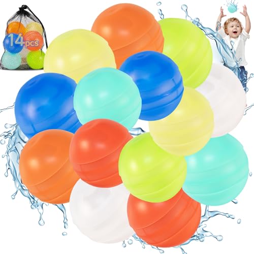 Bzavor 14 Stück Wasserbomben Wiederverwendbar mit Mesh Bag, Silikon Wasserbomben Wasserballons Wiederverwendbar, Reusable Water Balloons, Wiederverwendbare Selbstschließend Wasserbomben für Kinder