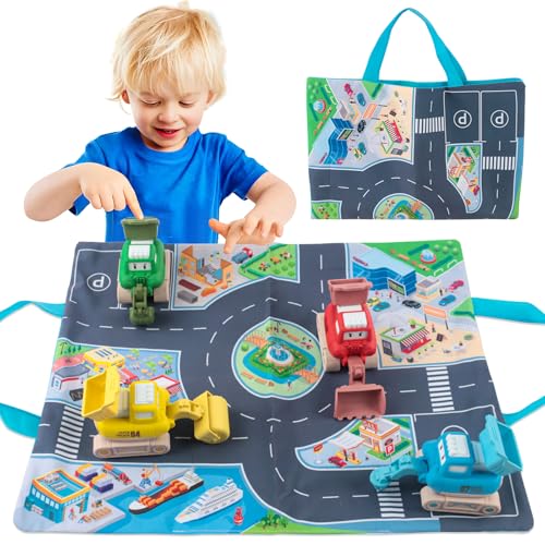 JWTRSVTY 4Pcs Auto Baufahrzeuge Kinderspielzeug, Baby Bagger Spielzeugauto, Pull Back Spiele Autos, Bagger Starten Spielzeugautos Mit Spielmatte, für 1-9 Jahre Jungen Mädchen Kinder Spielzeug Geschenk
