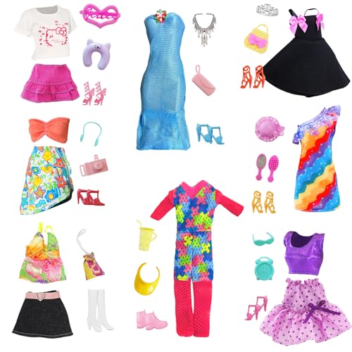 Sommermode-Puppenkleidung: Sie erhalten 35 Teile farbenfroher, modischer Sommer puppenkleidung und Accessoires, darunter ein rosa Rockset, ein lila Rockset, ein Regenbogenkleid, ein Kleid mit Schleife, einen langen engen Rock, ein Jeansrockset, einen Taucheranzug und einen Bikini. 8 Paar Schuhe und 16 Accessoires reichen aus, um zu allen Kleidungsstilen zu passen. Hochwertiger Stoff: Das exquisite Puppenkleidungsset ist handgefertigt aus sicheren Stoffen, die weich und angenehm anzufassen sind, leuchtende Farben und lebendige Muster haben. Es enthält 8 verschiedene Kleidungsstile, in denen Puppen süß aussehen und die Ihr Kind nach Belieben kombinieren kann. Die Accessoires bestehen aus hochwertigem Kunststoff, sind ungiftig und geruchsneutral, sodass Kinder unbeschwert damit spielen können. Einfach zu verwenden: Unser Modepuppen-Kleidungsset eignet sich sehr gut für 30 cm große Puppen. Dank des selbstklebenden Designs und des elastischen Gewebes lässt es sich leicht an- und ausziehen. Kinder können Puppen problemlos umziehen. Fördert Spaß & Fantasie: Das süße Puppenset enthält verschiedene Arten von Puppenzubehör wie Kameras, Kissen, Kopfhörer und Wecker, die das Zusammenpassen der Puppen interessanter machen. Es kann auch die Fantasie und Kreativität von Kindern fördern und die praktischen Fähigkeiten und das Denkvermögen von Kindern im Spiel trainieren. Perfekte Geschenke für Kinder: Das Sommer-Puppenkleidungs- und Accessoire-Set von Xerteam präsentiert sich in einem brandneuen Design. Der Stil ist modisch und süß und erfüllt den Wunsch des kleinen Mädchens, zur Prinzessin zu passen. Es ist ein perfektes Weihnachts-, Oster-, Kindertags-, Party- und Geburtstagsgeschenk für Kinder! Verschönern Sie die Puppengarderobe Ihrer Kinder und genießen Sie den Spaß an passenden Puppen!, Hersteller: Xerteam