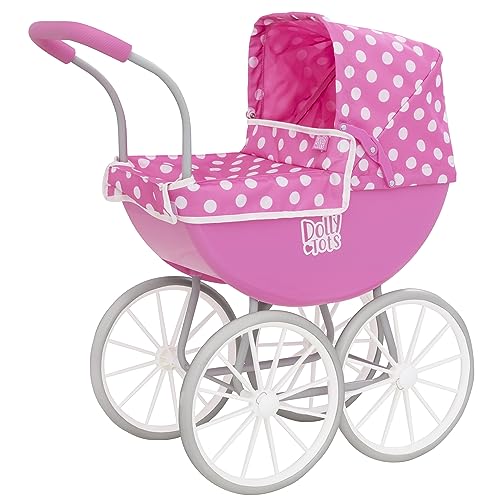 Dolly Tots Mein Erster Puppenwagen Pink Polka Dot | Traditioneller englischer Puppenwagen | Kinderwagen mit weißen Rädern & passender Bettwäsche | Rollenspielzeug für Kinder ab 3 Jahren