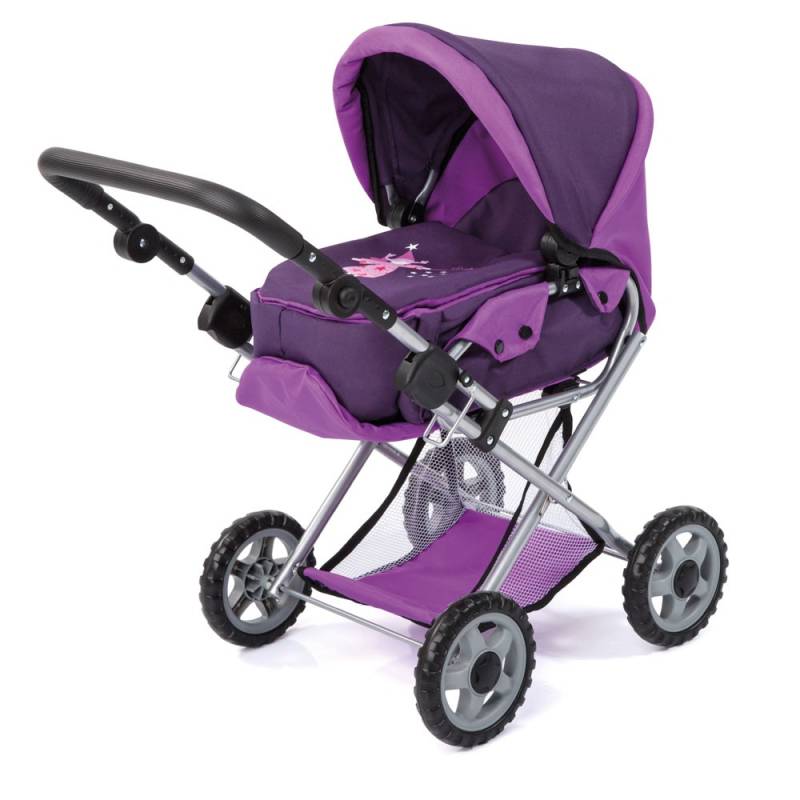 Kombi-Puppenwagen Maxi, Farbe lila Der Kombi-Puppenwagen Maxi ist in einer modernen, frischen Farbe und vielseitig einsetzbar. Die Tragetasche kann aus dem Puppenwagen herausgenommen werden und enthält ein extra Kissen und Deckchen. Entnimmt man die Tragetasche und verstellt die Rückenlehne und die Fußstütze, kann die Puppe im Handumdrehen in einem Sportwagen sitzen und mit dem integrierten Gurt angeschnallt werden. Anhand des verstellbaren Griffes ist der Puppenwagen auch schon für die kleinsten Puppenmuttis oder Puppenvatis geeignet. Für den leichten Transport lässt sich der Wagen einfach zusammenklappen und bietet Platz für Puppen bis zu 42 cm. Maße: Schieberhöhe (cm): 29-65 Artikelmaße cm: 72 x 36 x 65 ACHTUNG! Nicht geeignet für Kinder unter 3 Jahren. Achtung! Aus Sicherheitsgründen bitte alle Drähte, Plastik- oder Gummibänder, Anhänger oder sonstige Befestigungsmaterialien vom Spielzeug entfernen, bevor das Spielzeug dem Kind in die Hände gegeben wird.