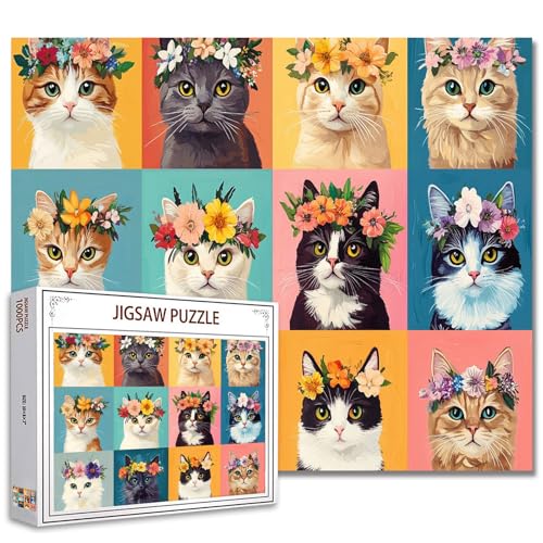 Cute Cats Wearing Flower Crowns Jigsaw Puzzle,Furry Cats Adorable Portraits 1000 Pieces Jigsaw Puzzles for Adults,27 x 20 Inches Puzzles ,HD Quality Fantasy Puzzle Gift,Family Activity for Game Night