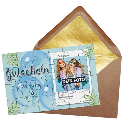 Gestalten Sie Ihr persönliches Foto-Puzzle mit einem Foto Ihrer Wahl, dem Namen, Hashtags und Wunschtext - Klicken Sie auf "Jetzt anpassen" und passen Sie Ihr Puzzle an. Ein personalisiertes Puzzle als Gutschein aus 24 Teilen ist das optimale Geschenk für beste Freundinnen, den Partner, Familie und Freunde. Überrasche all deine Lieblingsmenschen mit dem selbst gestalteten Gutschein in Puzzle-Form. Mit dem Lieblingsfoto, deinem Wunschnamen, den Hashtags und einem Wunschtext von 3 Zeilen kannst du dein Puzzle ganz einfach personalisieren. Eine persönliche und kreative Geschenkidee, wenn Stück für Stück der ganz spezielle Gutschein gepuzzelt wird. Das Puzzle in den Maßen 16,5 x 11 cm besteht aus robustem 2 mm starken Karton - Das Puzzle wird mit einem schönen Kraftkarton Briefumschlag mit edlem Gold-Inlay geliefert. Perfekt zum Verschenken und Verschicken. Der robuste Karton wird mit hoher Auflösung und langlebigen Farben bedruckt - die Oberfläche erscheint glänzend und zeichnet sich durch eine hohe Farbbrillanz aus - Das Puzzle wird nicht als Ganzes versendet. Jedes Puzzleteil ist individuell für maximalen Puzzle-Spaß! PR PRINT ROYAL - Alle PR Print Royal Produkte werden in Deutschland designt und in liebevoller Handarbeit bedruckt. Um Ihnen ein edles und hochwertiges Produkt zu präsentieren, nutzen wir modernste Technologie für den Druck unserer Artikel. - Made in Germany - seit über 20 Jahren ihr Spezialist für bedruckte Trinkgefäße, Textilien und Laserprodukte - viele weitere Artikel finden Sie bei uns im Amazon Shop!, Hersteller: PR Print Royal