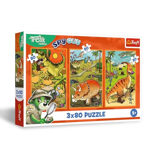 Trefl – 3in1 Puzzle: The Treflik Family, Trefliks in der Welt der Dinosaurier - 3 x 80 Teile, DREI-Puzzle-Set für Kinder ab 5 Jahren von Trefl