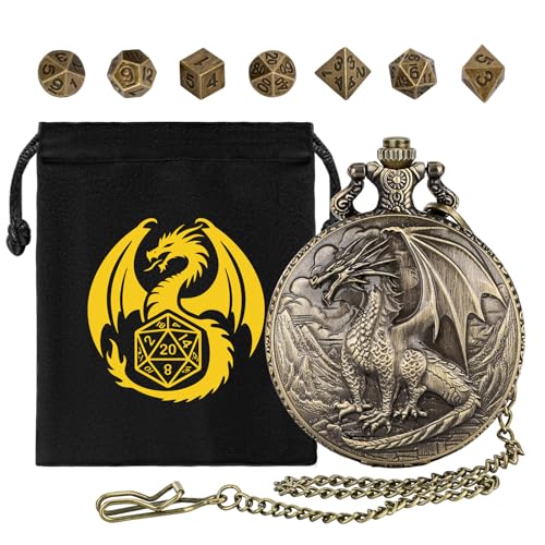 EINZIGARTIG ENTWERFEN: Diese zinklegierende taschenuhr schale hülle wurde exquisit mit einem faszinierenden stehender drache hergestellt und wurde genial umverstanden, um ihr 7 mini polyedrisch würfel set zu speichern PREMIUM GESCHENKSET: Das eine wunderschön gestaltete Geschenktasche mit Drachen Logo, um es zur perfekten wahl für jeden besonderen anlass zu machen, sei es geburtstage, vatertag, valentinstag oder weihnachten LANGLEBIG KONSTRUKTION: Diese taschenuhr hülle stellt sicher, dass ihr kostbares mini würfel set aus stabiler zinklegierung geschützt und sicher bleibt; sie stapfen den strapazen der reise und des täglichen gebrauchs, um die langlebigkeit KOMPAKT UND TRAGBAR: Mit der kompakten größe dieses würfelshalters zum thema stehender drache können sie ihr mini würfelset, wohin ihre abenteuer sie führen, bequem tragen, um sicherzustellen, dass ihre spielerwartungen immer in reichweite sind VIELSEITIGES ZUBEHÖR: Egal, ob sie ein erfahrener dungeon meister oder ein neuer abenteurer sind, dieser einzigartige würfelspeicherbehälter verleiht ihrem spielzubehör einen hauch von steampunk inspiriertem charme NACHDENKLICHES GESCHENK: Dieser stehender drache taschenuhr schale hülle mit mini dnd würfel set ist nicht nur funktional, sondern auch ein sammlerstück, das würfel enthusiasten und steampunk liebhaber gleichermaßen erfreut, Hersteller: DND NURD